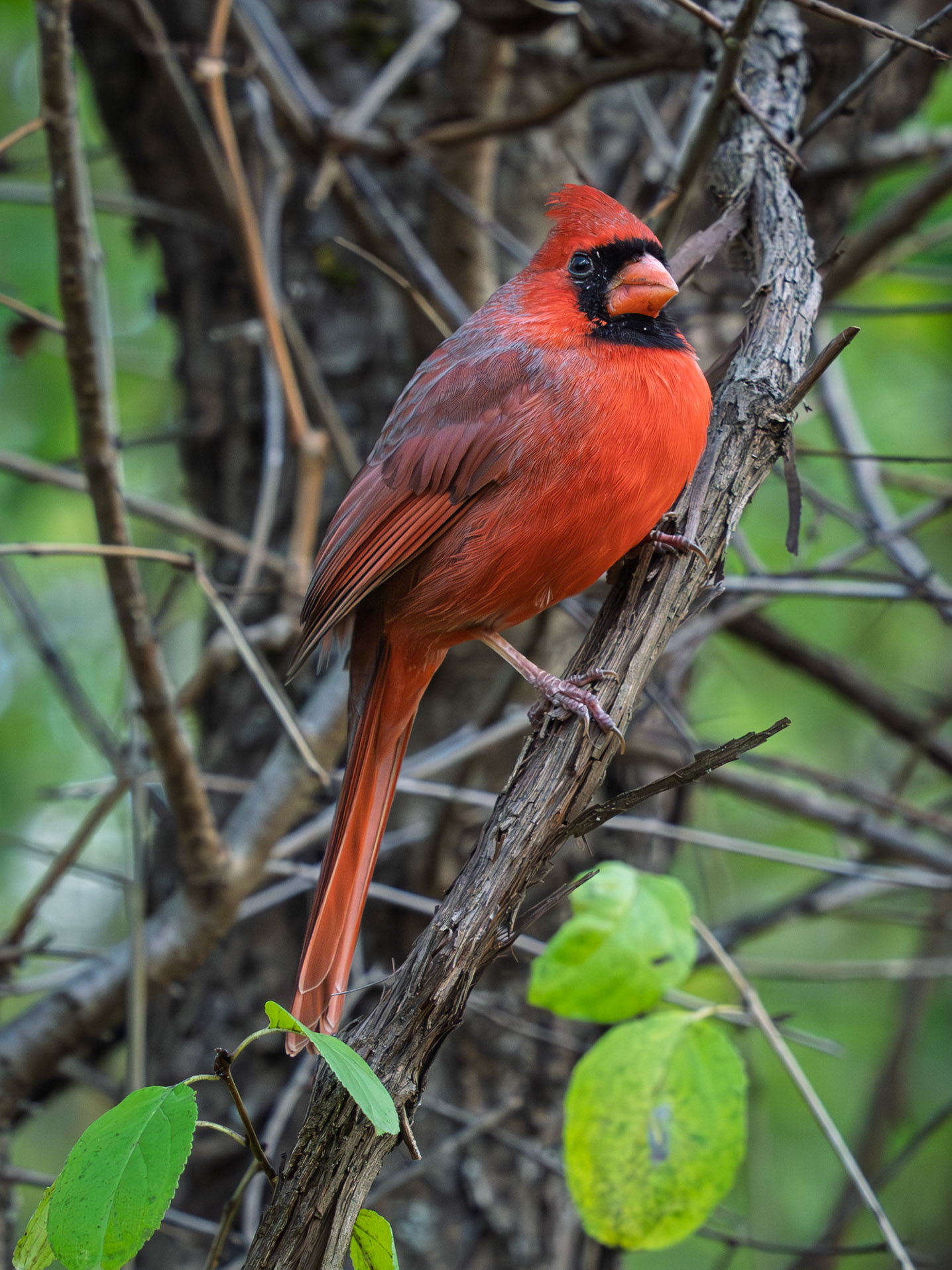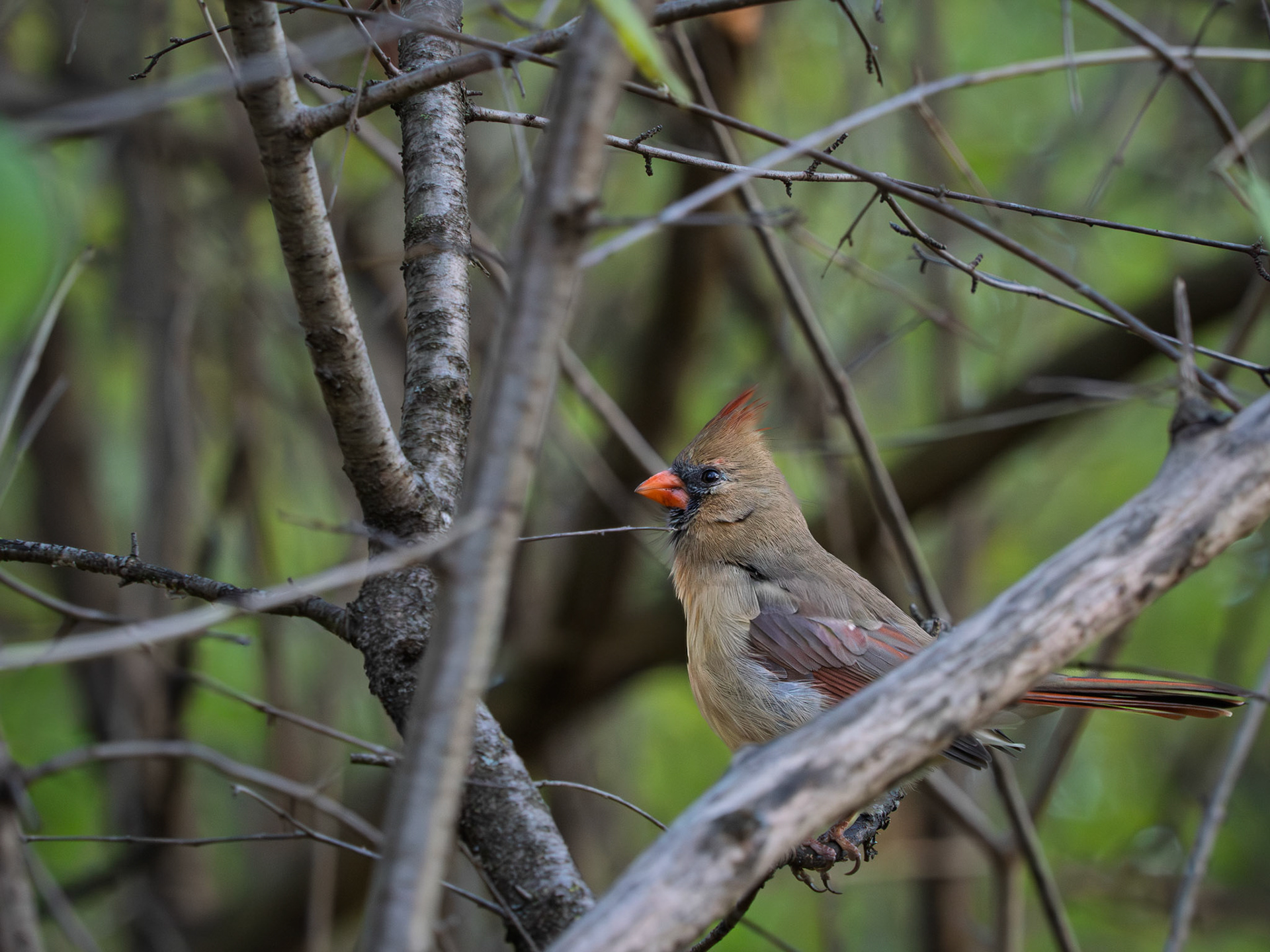 I could hear the occasional "squeak" of the cardinals but they were hanging back in the bush. Finally a male came out to see if I had any seeds. They are very wary and keep a good 25 feet minimum away. This one started on the ground, then hopped up into some branches, he watched as I put some seeds down and then I backed off. But surprisingly he couldn't find the seeds. A black squirrel likely unnerved him and he lost his concentration.