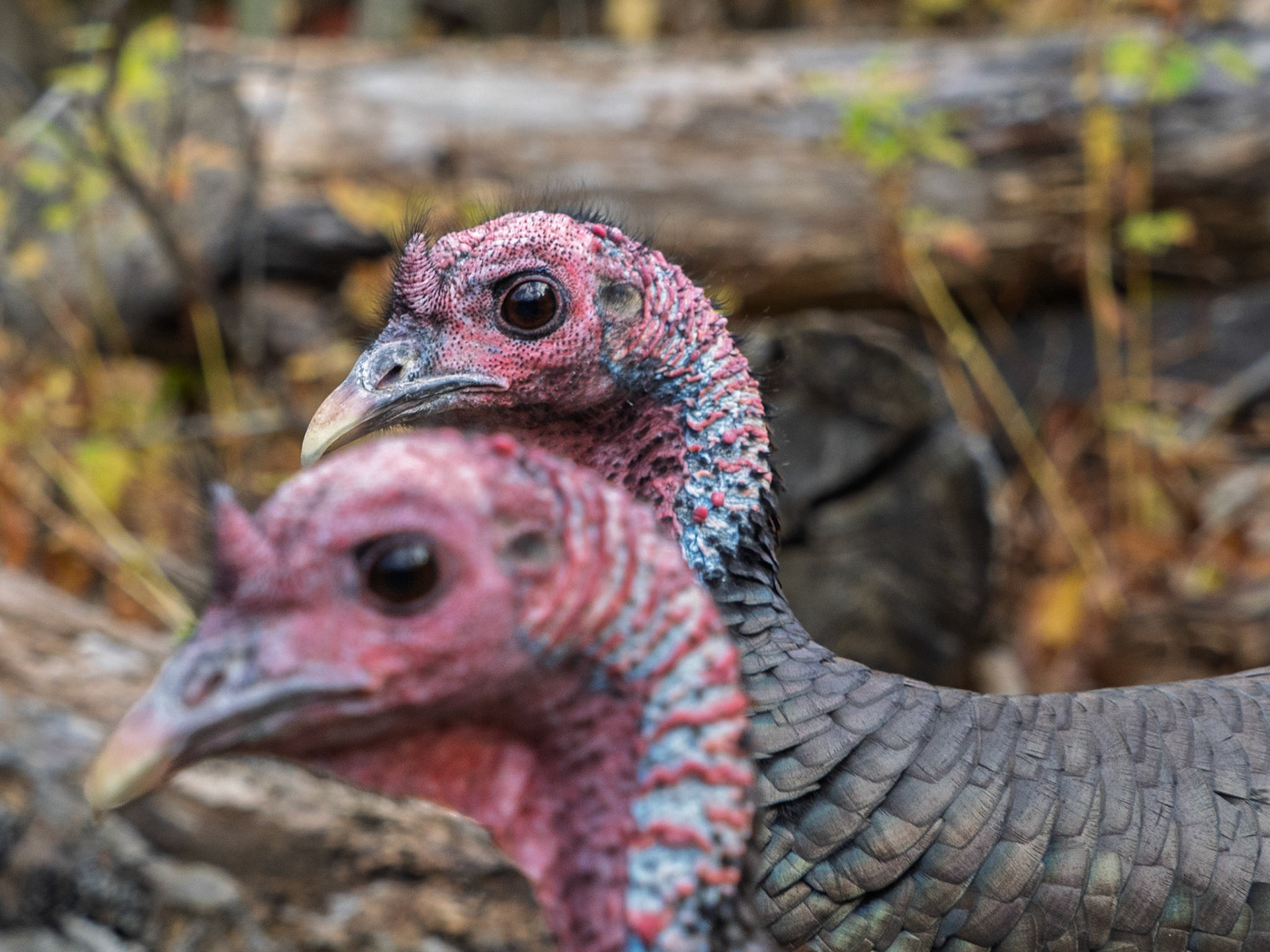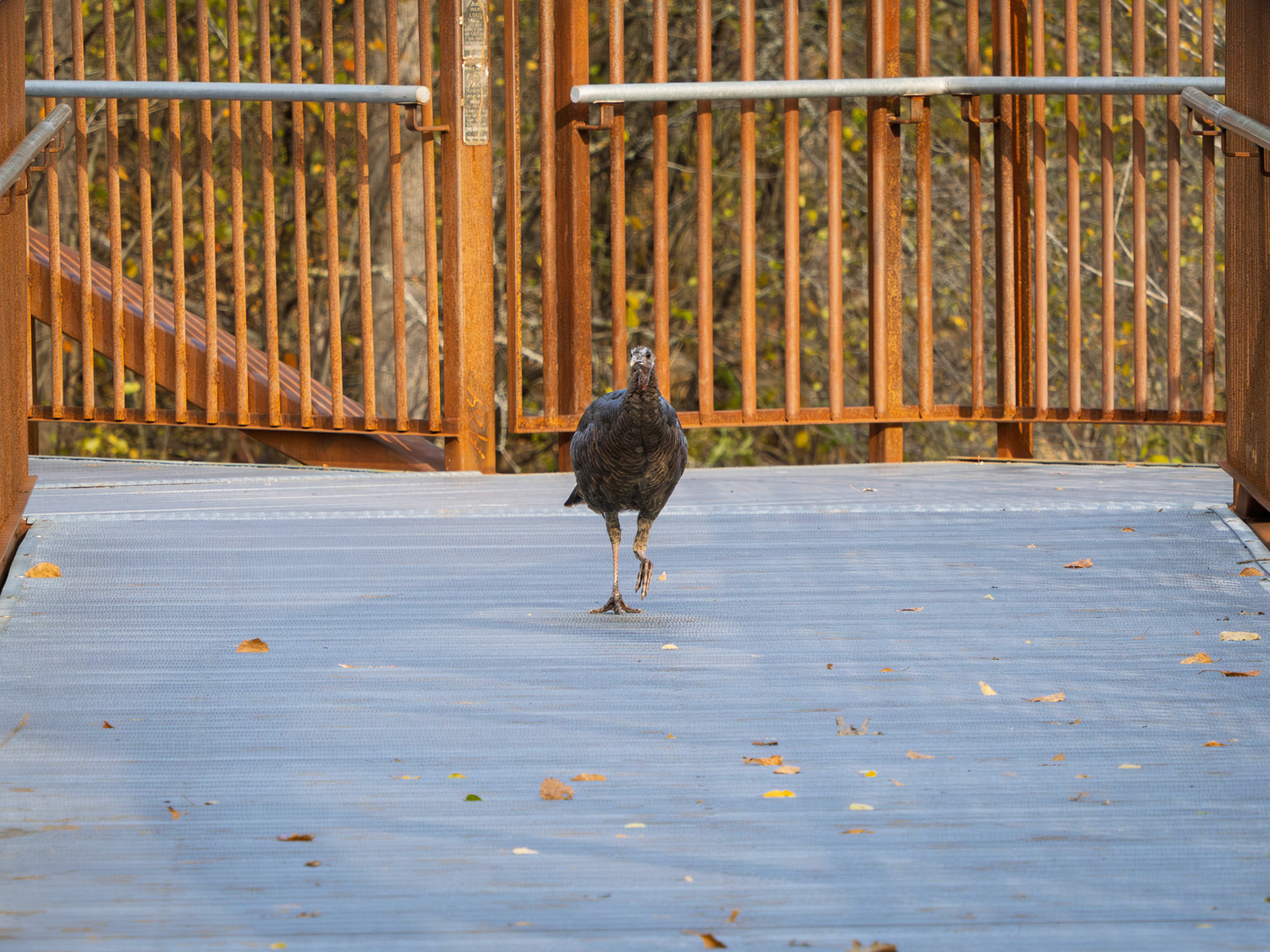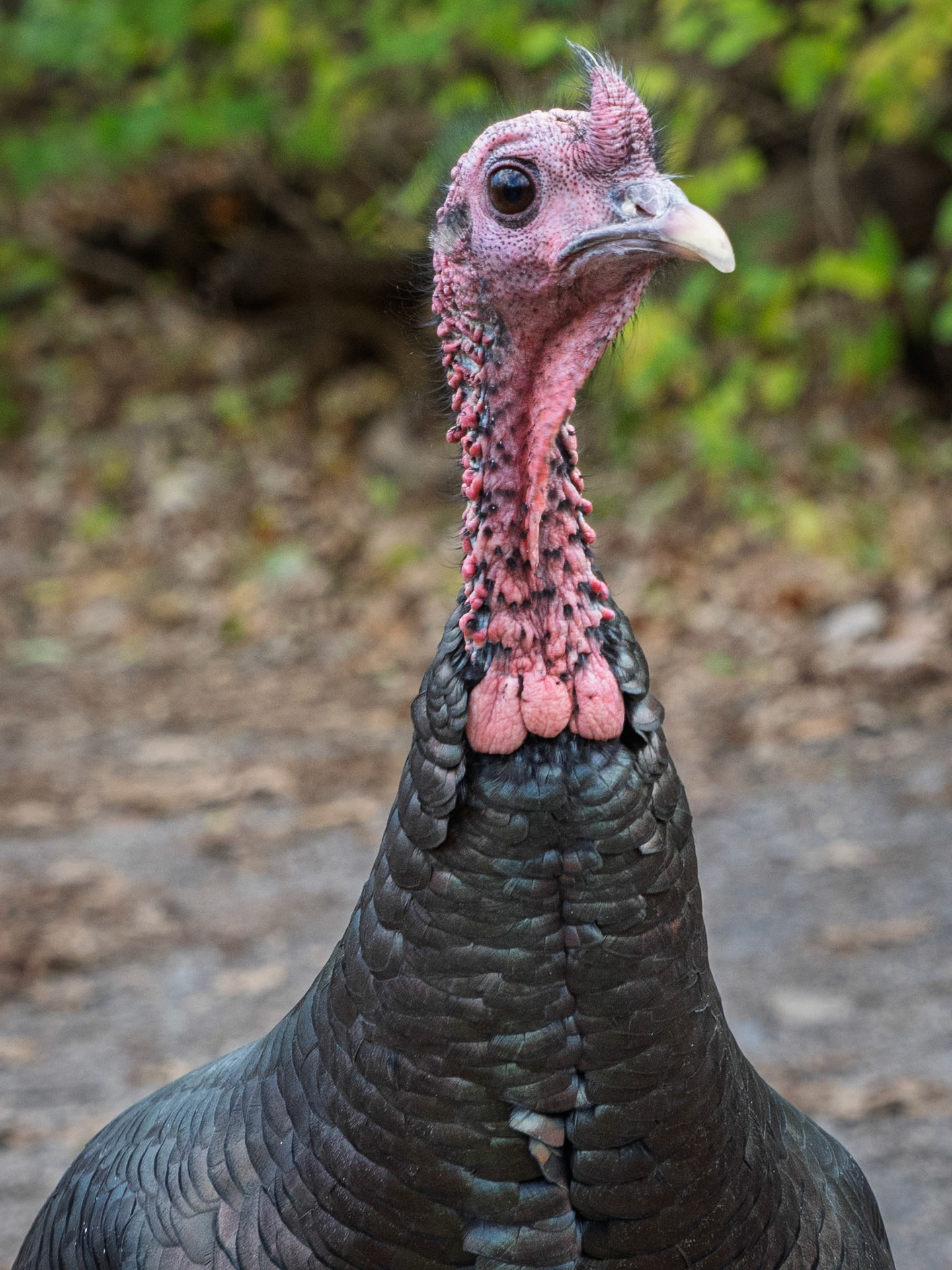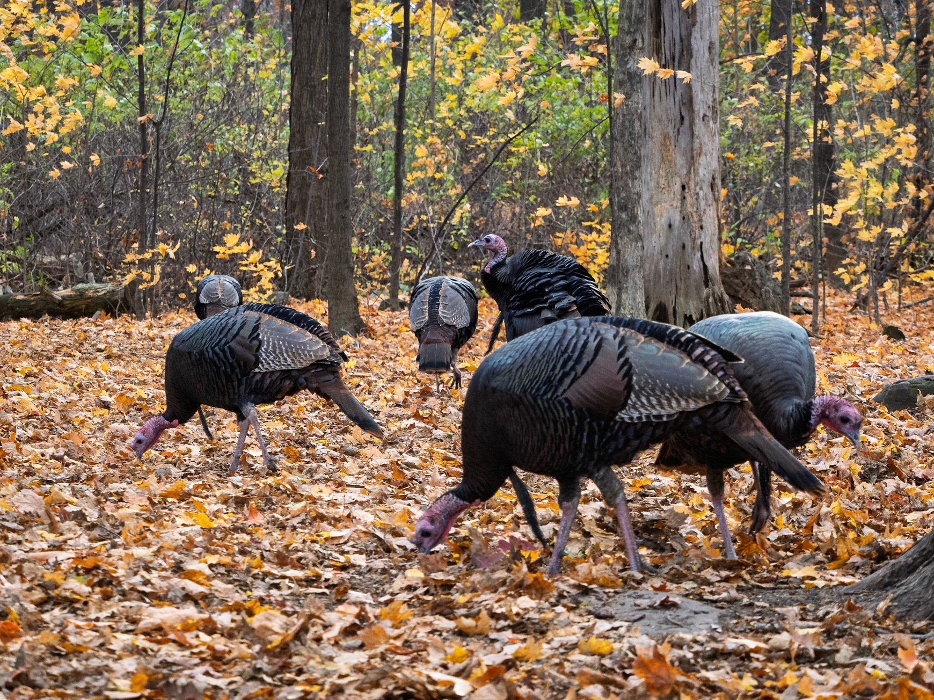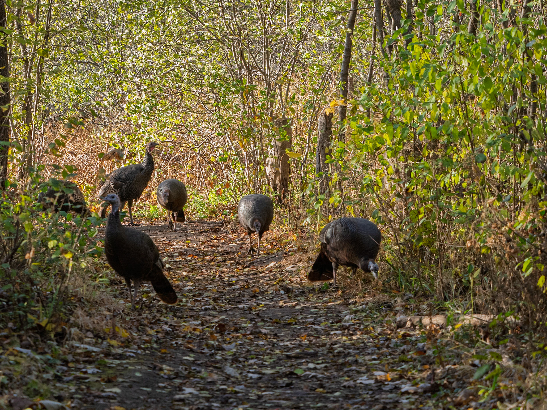 The turkeys seemed well spread out. A small group were in the first opening along the trails. Another group of five didn't mind passing me kneeling down on the path to get better photos, but one male retreated rather than pass me. Another group were over on the far side of the lake where the trail is a bit more narrow. None of that group wanted to pass by me, but once I got up, they weren't worried about my walking right through them.