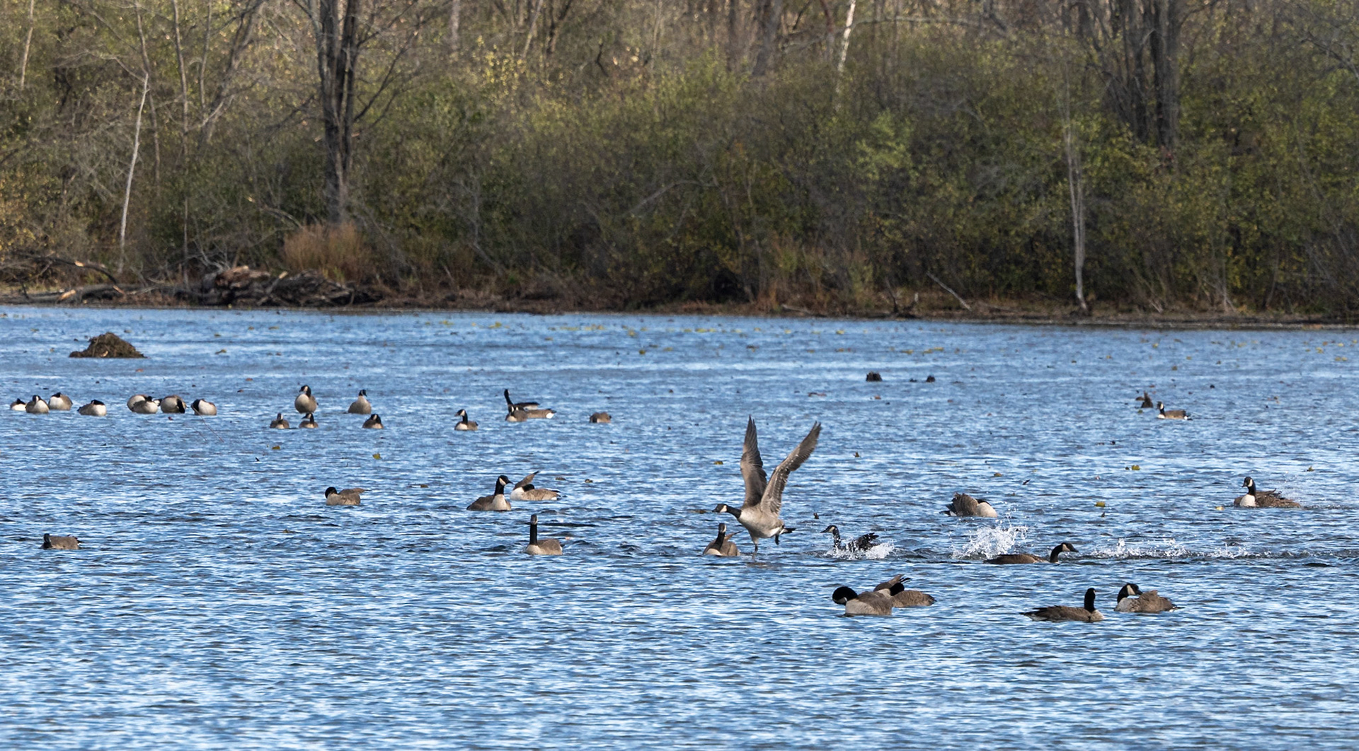 I arrived after lunch, an unusual time for me, to find the lake full of Canada geese. They seemed not interested in going anywhere and no signs of more arriving. There were a good number of people enjoying the trail (something I am not used to). One of the geese, in the second and third photo, was imitating a cormorant, running on the water, rather than flying. At 3pm, with the lake loud with geese honking, the geese all left within about 15 minutes leaving silence behind.