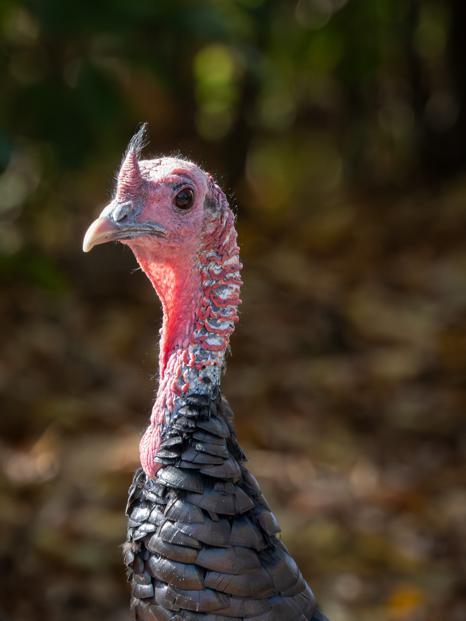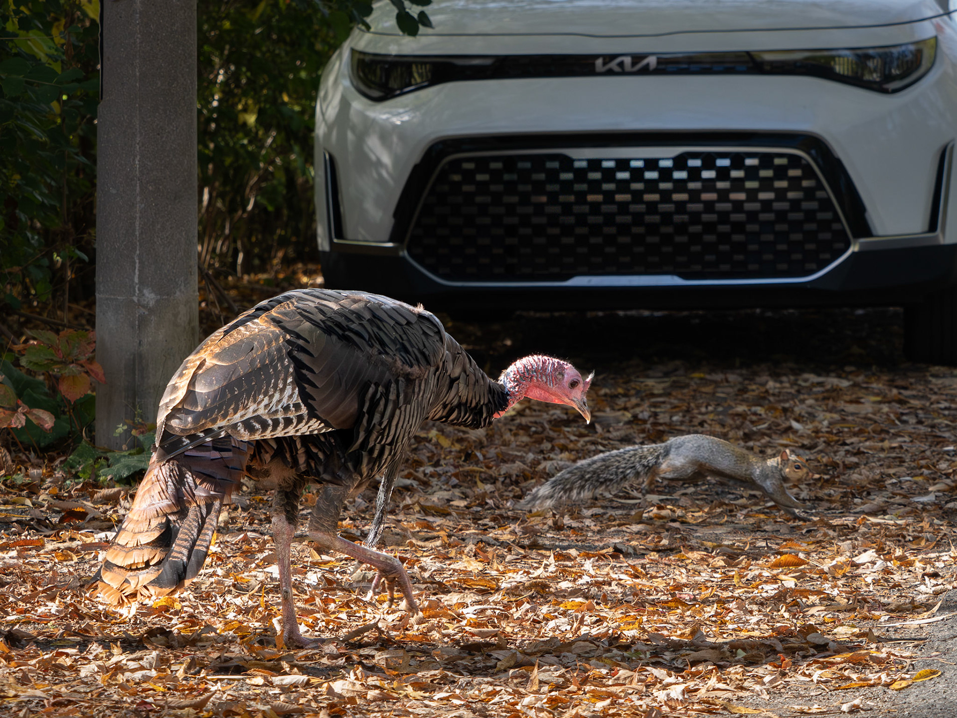 A first year male wild turkey (and friends e.g. squirrel in right photo) welcoming people at the trail front entrance hoping people might drop of some seeds for him