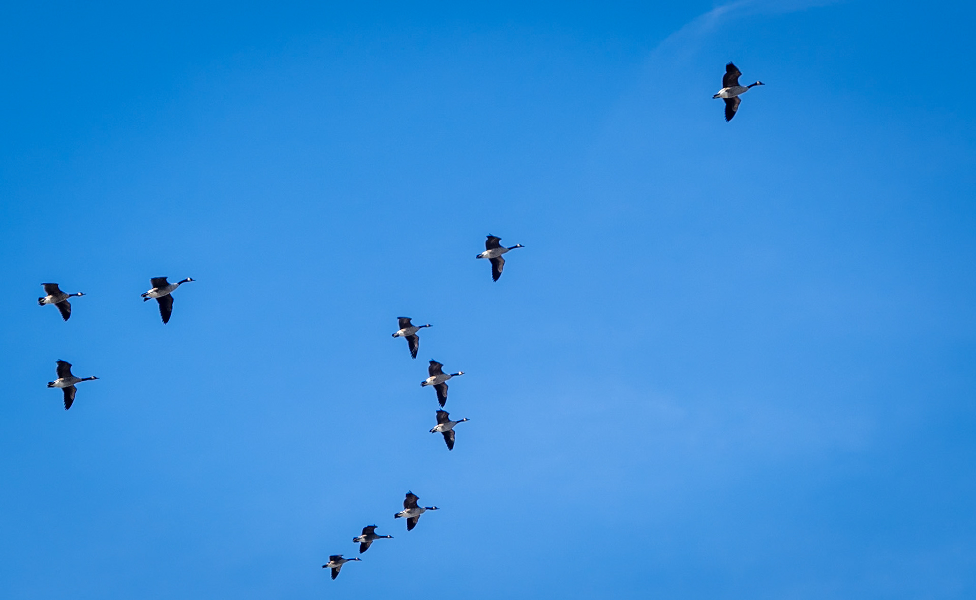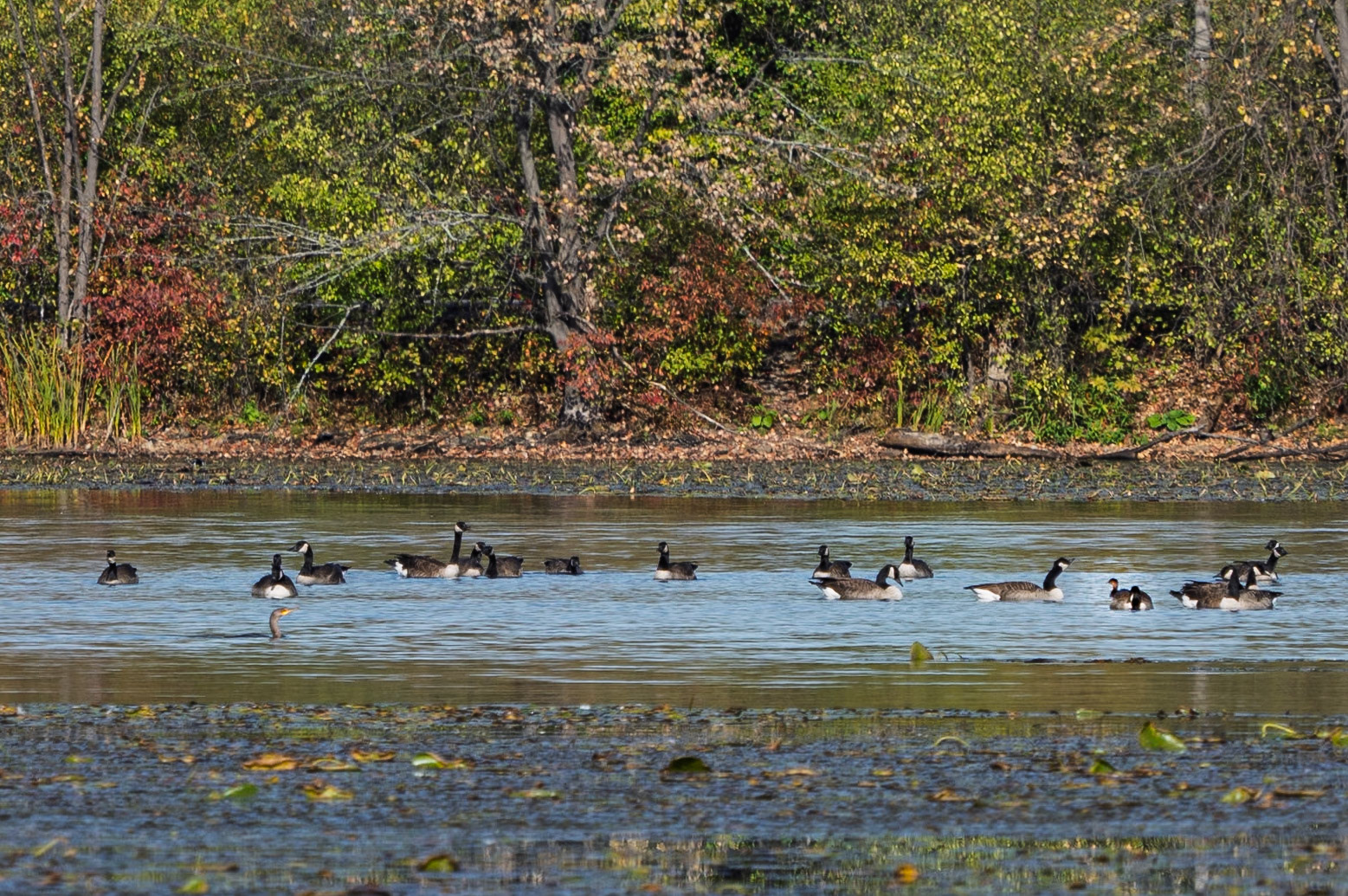 Canada geese are flocking. They were in the air and on the lake. If you click on the second photo and look closely, there is a cormorant on the left side and a grebe in amongst the geese on the right.