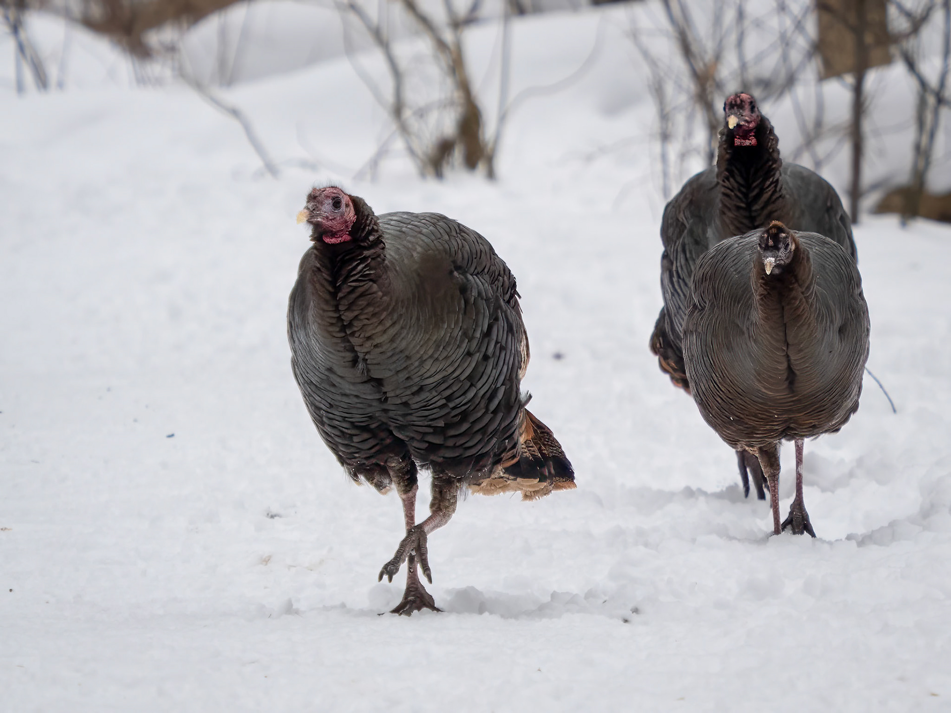 The turkeys must have been having a hard time finding enough food, but obviously they had as we counted all 19 when we met up with them. They were having no problem maneuvering on the human packed paths, but once off the paths, walking was difficult. Where a turkey followed an earlier turkey track, they weren't having too much trouble, but venturing into undisturbed snow to look for food was a challenge.